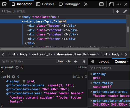 The Grid Inspector allows you to examine CSS Grid Layouts using the Firefox DevTools, discover grids present on a page, examine and modify them, debug layout issues, and more.